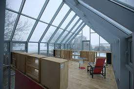 transformed by the fourth and largest element in the group, the 50 ton mobile roof and wall enclosure which traverses the site. The mobile roof and walls form an insulating structure that passes over the annexe, house and glasshouse, creating combinations of enclosure, open-air living and framing of views according to position.