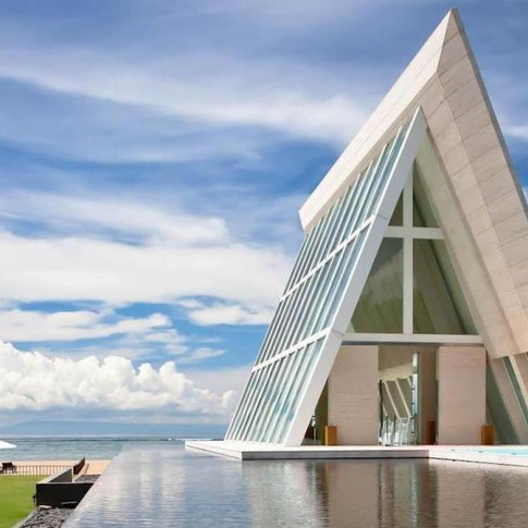 Infinity Glass Chapel in Bali. Its asymmetrical, stunning lines overlook shimmering reflection pools and walkways of finest marble. Infinity Chapel is an architecturally unique wedding venue, floating two meters above sea level. Infinity's simple, off-set triangle shape and physical attributes of marble, glass and steel offer an ultra-modern and one-of-a-kind venue. The clean cut of the building show the characteristic of NEW architecture style. The remarkable steel-framed glass wall that makes up the north side of the triangle embodies the delicate and nurturing characteristics of the bride as she supports the equally impressive marble south side, the stoic groom. There is architectrure, thefore there is interaction. With the present of architetcure, there is mental health, power and pleasure that can feel by the occupant or visitor ( Sacrifice - "7 lamps in architecture" by John Ruskin).