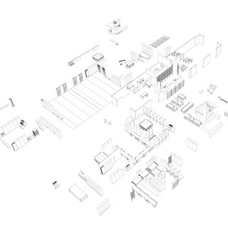 The resto-bar of the slaughterhouse has been furnished with elements taken from the cafeteria of the former BNP-Paribas-Fortis Bank headquarters in Brussels designed by Christophe Gevers, famous for his restaurant designs. This allowed the conservation of this unique ensemble. All the storage cabinets of the arts centre with doors in a light-colored wood veneer, come from another dismantled Brussels office building and were carefully numbered, disassembled, trucked, and re-assembled, sometimes transformed on-site. They also designed new gear, such as the 60 ultra-light tables of beech-rimmed sandwich panels resting on aluminum trestles meant to meet with the need for flexibility of the workshop spaces and meeting rooms. Rotor designed them to be as easily moved and stored as possible. Most of the equipment, including the tables, was built by a Rotor team that lived and worked for two months on-site, using the artist residences of the centre to sleep, and a newly installed workshop to work.